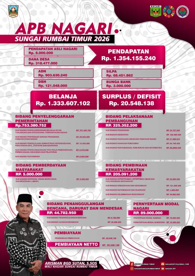 Selain laporan realisasi tahun sebelumnya, Pemerintah Nagari Sungai Rumbai Timur juga telah menetapkan APB Nagari Tahun Anggaran 2026. Perencanaan anggaran tersebut disusun berdasarkan kebutuhan nagari dan hasil musyawarah bersama, dengan fokus pada peningkatan kualitas penyelenggaraan pemerintahan, pembangunan nagari, pembinaan kehidupan sosial kemasyarakatan, serta pemberdayaan ekonomi masyarakat.
